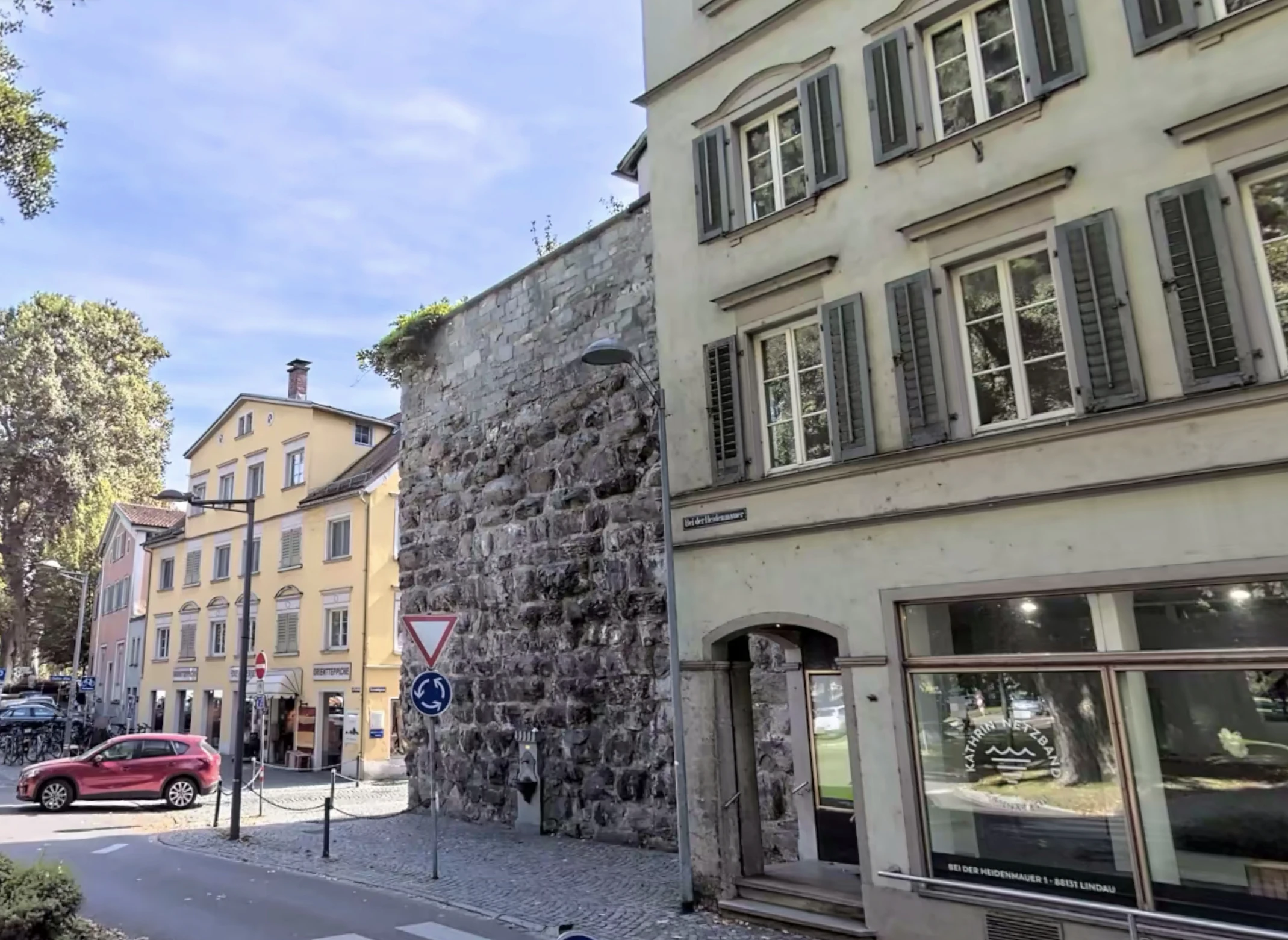 es ist ein widersprüchlicher Name, die Heidenmauer, weil die als „Heidenmauer“ bezeichnete Eingangssituation in die Altstadt, am Nordostende der Insel, aus wuchtigen, großquadrigen Hausteinen sehr hoch errichtet wurde. Sie war lange Zeit ein sich übereck erstreckender Restteil einer Stadttoranlage, der eindeutig römische Bauweisen aufweist und daher bautechnisch sowohl frühere Germanenzeit als auch die spätere frühchristliche Bauweisen ausschließt. Einen bestätigenden Hinweis auf die erste Zeit, den römischen Ursprung der damit umfänglichen Stadt beschreibt im 17. Jhdt. Michel de Montaigne 1580. Zit.: „Ich vergaß beim Kapitel über Lindau zu erwähnen, daß am Eingang zur Stadt eine große Mauer steht, die augenscheinlich bis ins Altertum hinaufreicht; ich bemerkte keine Inschrift daran, aber ich höre, daß sie im Deutschen alte Mauer heißt, was man auch mit ihrem römischen Ursprung erklärte.“