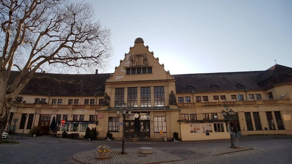 Das Empfangsgebäude mit der weiten tonnenförmigen Schalterhalle steht unter Denkmalschutz und wurde zwischen 1913 bis 1921 in einem relativ späten Jugendstil als Ersatz für einen Vorgängerbau errichtet. Gedeckt von Satteldächern und ausgestattet mit Quergiebeln steckt hinter der zur Stadt ausgerichteten Fassade ein quadratischer Bau um einen Innenhof.