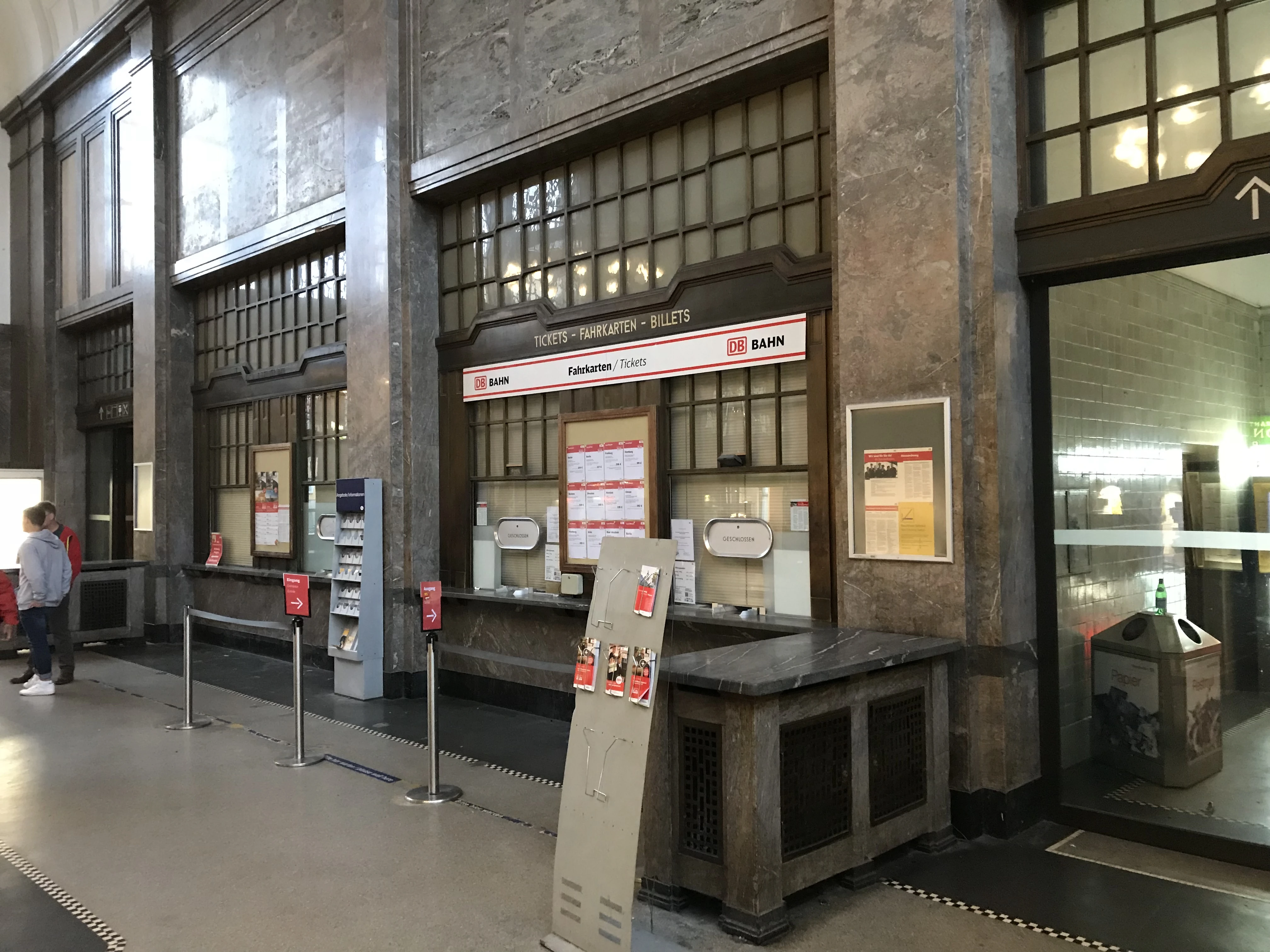 Die Schalterhalle mit dem Haupteingang ist die Verknüpfung dieser beiden Ostflügel. Hinter der Schalterhalle befindet sich ein überdachter Bereich, der zu den Bahnsteigen des Kopfbahnhofs führt. Dieser Bereich ist nach Westen und zu den Bahngleisen hin offen.