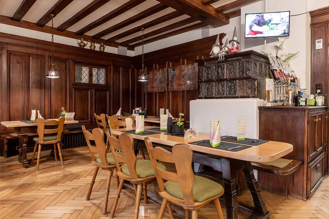 - Die gute Stube kurz bevor aufgemacht wird. Einen Stammtisch gibt es übrigens nicht nur hier drinnen, sondern auch im Biergarten.